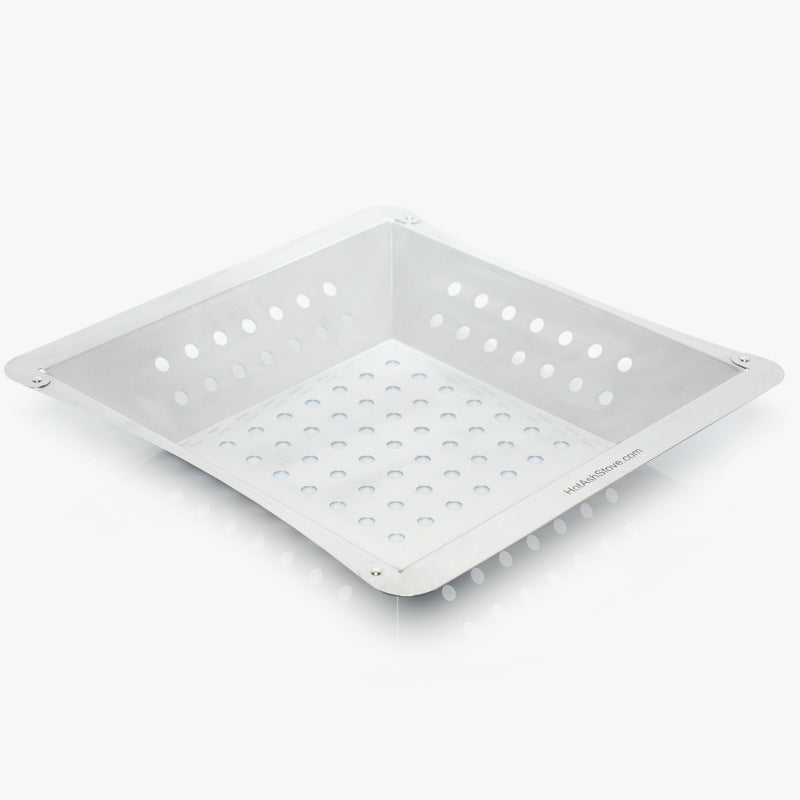 The Hot Ash Grill Basket is a durable, USA-made grilling accessory perfect for vegetables, seafood, and smaller cuts of meat. With precision-cut holes, it allows smoke and heat to evenly infuse your food — no more lost items falling through the grates.
